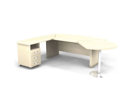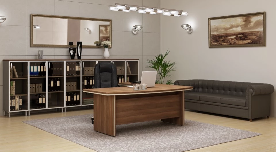 Потрясающее сочетание округлых форм, прямых линий и углов – вот, что первым делом попадется на глаза посетителю, который войдет в Ваш офис в случае, если Вы выберите этот набор. Кабинет руководителя Берлин Директор доступен в нескольких цветовых решениях, каждое из которых достаточно сильно отличается от предыдущего – это позволяет подобрать идеальный вариант, что подойдет к любому ремонту в офисном помещении. Разнообразные комплектации шкафов, полок, много приставных поверхностей – это обеспечит комфорт в хранении бумаг, папок, книг. Все необходимое будет под руками.