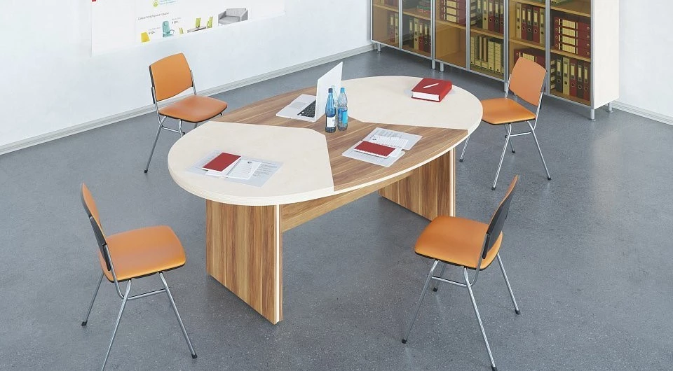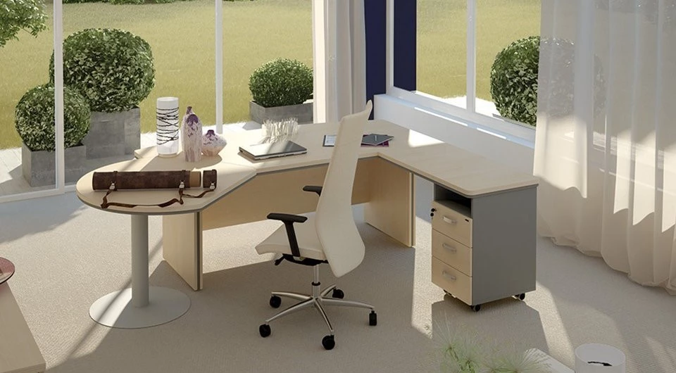 Первый цвет – дрифтвуд. Это довольно строгий и очень стильный выбор. Хорошо смотрится в сочетании с деталями белого или светло-серого цвета. Кокоболло является вторым решением. Это светлое оформление, которое смотрится ярко и свежо. Мерано-коричневый имеет интересную особенность в виде довольно четких полосок, которые добавляют стильный акцент в оформление офиса. Такие линии, воссоздающие рисунок дерева на срезе хорошо подчеркивают разнообразие линий и форм самой мебели. Береза – классическое оформление, которое способно сделать даже небольшую комнату просторной. Орех табак наиболее темный из всех доступных цветов.